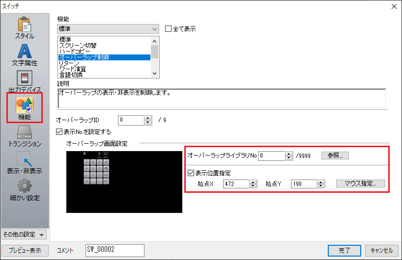5. スイッチをダブルクリックし、[機能]メニューで表示させたいオーバーラップライブラリNo.や表示位置を設定します。