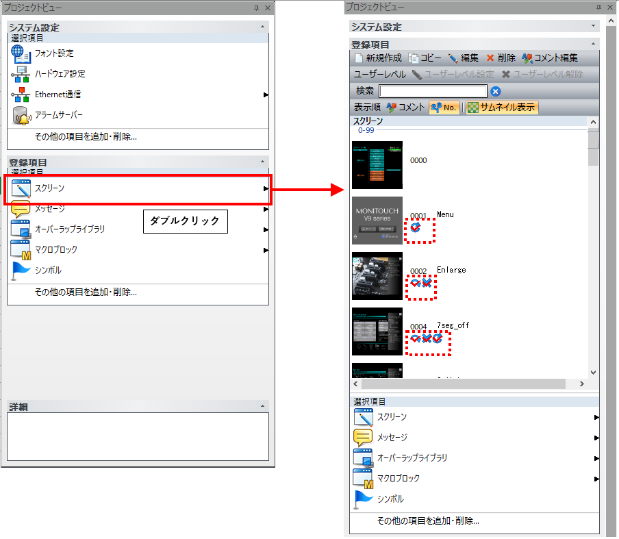 [スクリーン]をダブルクリックすると、スクリーンの一覧が表示されます。