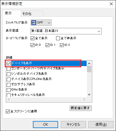 [表示]→[表示環境]→[表示]タブ→[□デバイスを表示]にチェックします。