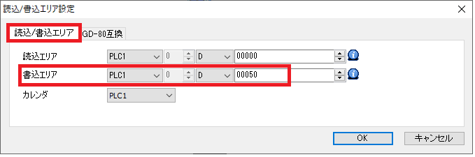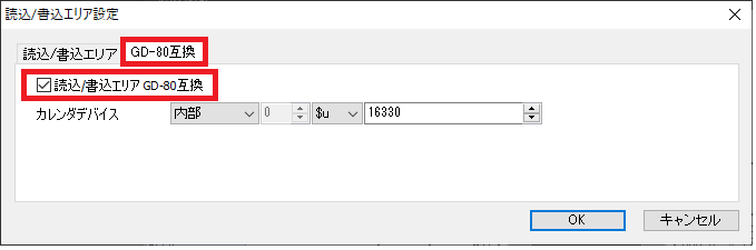 [GD-80互換]タブの[読込/書込エリアGD-80互換]チェックがあります。 この場合は、書込エリア n+1(=D51)にスクリーンNo.が格納されます。