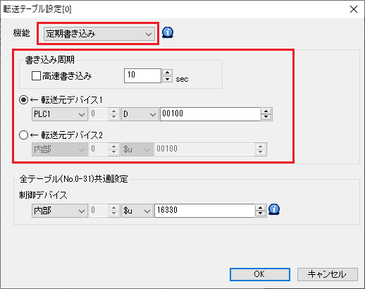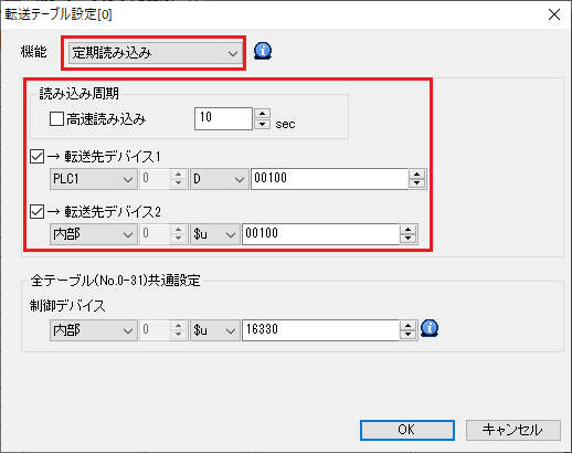 設定例:10秒ごとに、PLC2 WM100→ PLC1 D100と$u100 に読み込む