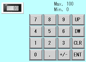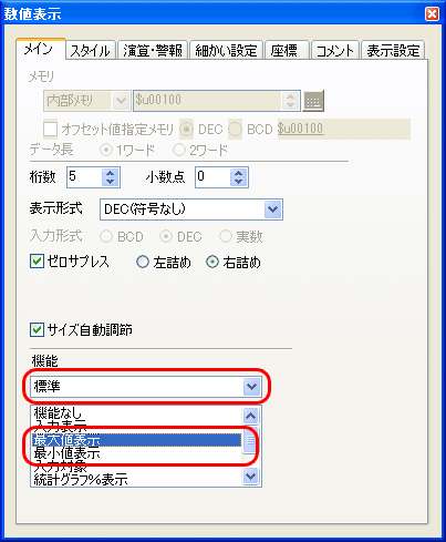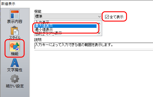 制限の最大値、最小値を画面上に表示させる場合、[機能]を[最大値表示]、[最小値表示]に設定した数値表示を配置します。