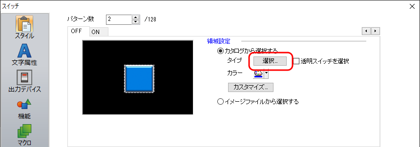 [スイッチ]ダイアログ→[スタイル]→[カタログから選択する]→[選択]をクリックします。
