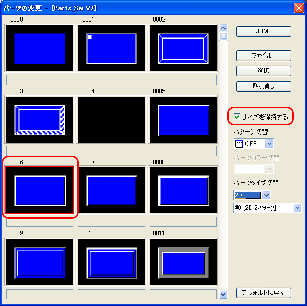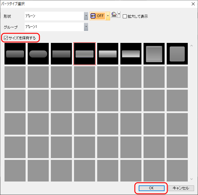* [□サイズを保持する]にチェックを入れると、配置されたパーツのサイズを保持したまま、 パーツの変更が行えます。