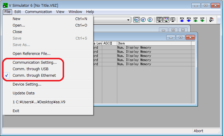 Configure settings for communication between the PC and the V series from the [File] menu. For more information, refer to "How to check the operation of screens without connecting to a PLC."