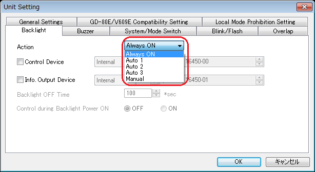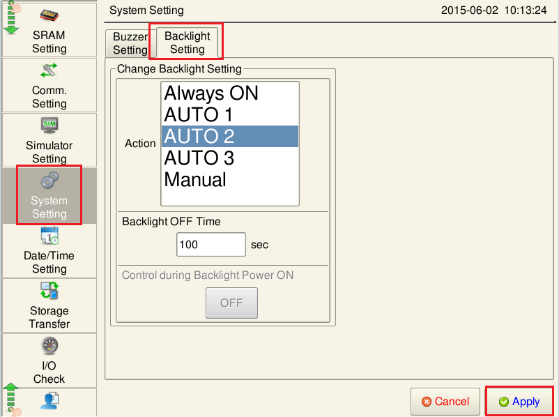 Local mode → [System Setting] menu → [Backlight Setting] tab