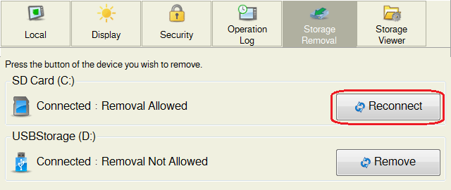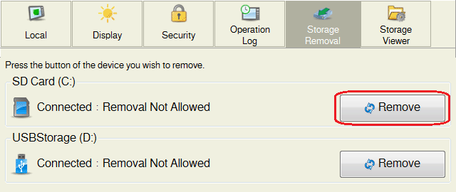 2. Press the [Remove] switch under [SD Card (C:)] or [USB Storage (D:)].