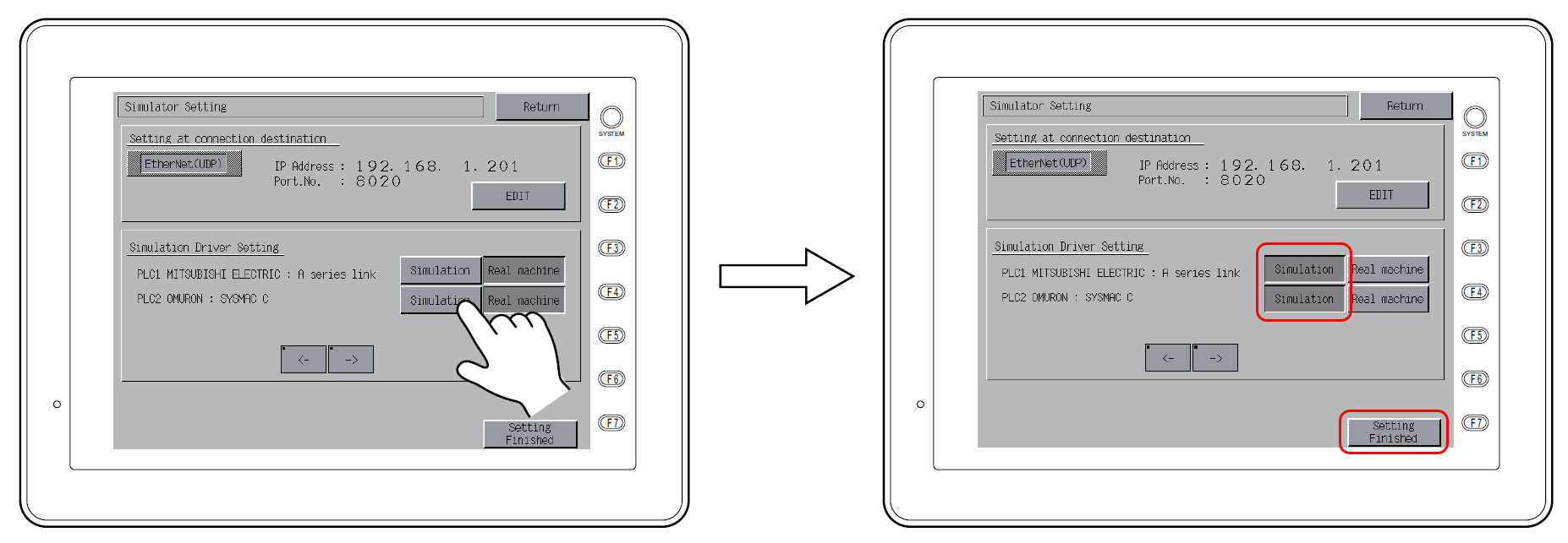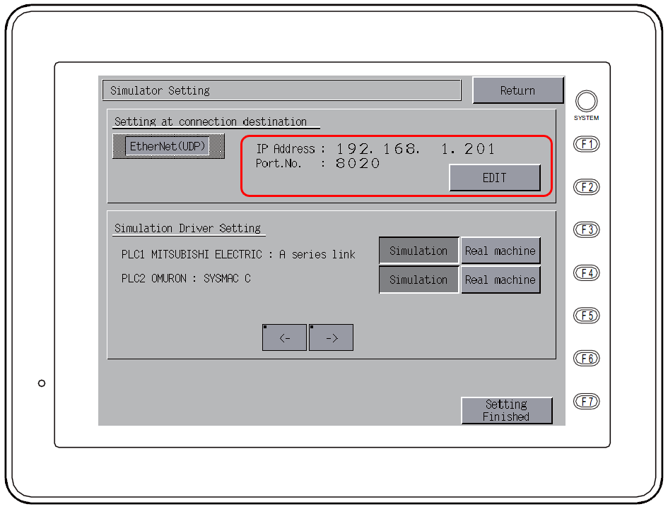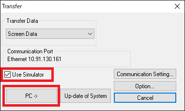 If not successful, click [Communication] → [End] on the simulator to abort communication. Be sure to select [File] → [Communication Setting] and check the settings.