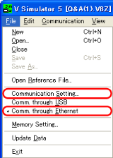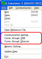 Select [File] on the simulator, check that [Comm. through USB] and [Comm. through Ethernet] are not checked, and click [Communication Setting].