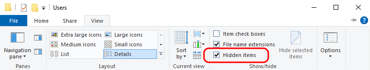 * If the [AppData] folder is not shown, select the [Hidden items] checkbox on the [View] tab.