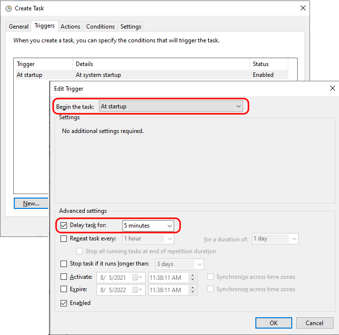 A delay time can be added to V-Server startup using Windows Task Scheduler. In this case, a shortcut does not need to be copied to the [Startup] folder.