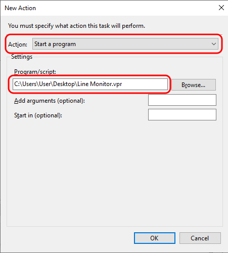 3. Set [Start a program] for [Action] on the [Actions] tab window and set the link to the V-Server project file in the [Program/script] field.