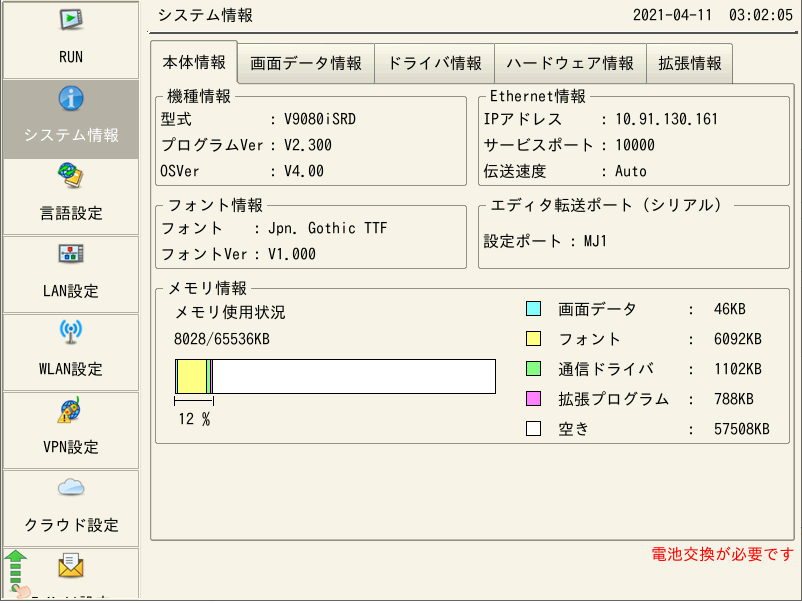 V10/V9の[ローカル画面]→[システム情報]右下に「電池交換が必要です」のメッセージが表示されます。