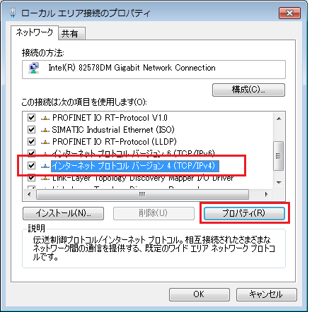 5. [ローカルエリア接続のプロパティ]で[インターネットプロトコルバージョン4(TCP/IPv4)]を選択し、[プロパティ]をクリックします。