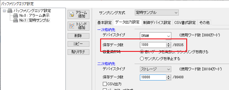 [システム設定]→[バッファリングエリア設定] →[データ出力設定]タブ→[一次格納先]→[保存データ数]